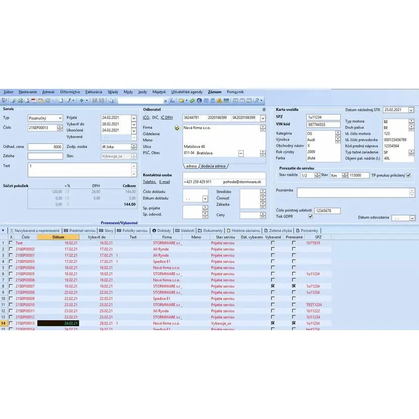 Řešení obsahuje samostatnou agendu pro evidenci vozidel a jejich parametrů s propojením na adresář. Při založení servisního případu jsou automaticky přeneseny technické parametry do servisní agendy, kdy technik na první pohled vidí celkový přehled.