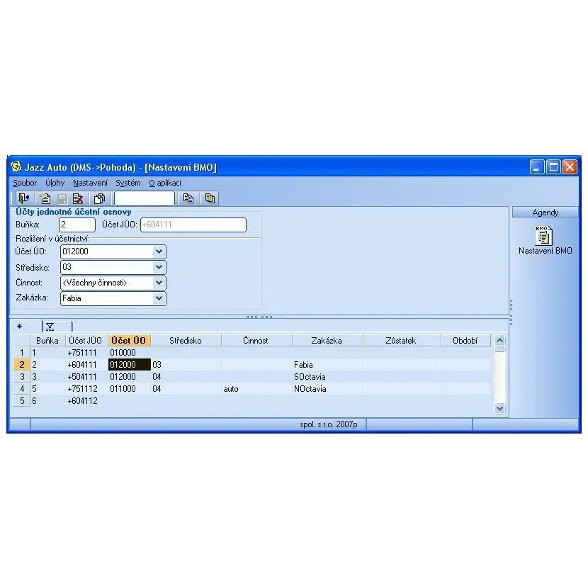 Velkou výhodou, kromě snadného propojení ekonomického systému POHODA se systémem BMO, je fakt, že v systému POHODA nemusíte vytvářet všechny analytické účty, které vyžaduje jednotná účtová osnova, ale pro podrobné analytické členění můžete využít i pole Středisko, Činnost a Zakázka. vaše účtová osnova se tak výrazně zjednoduší a zpřehlední.
