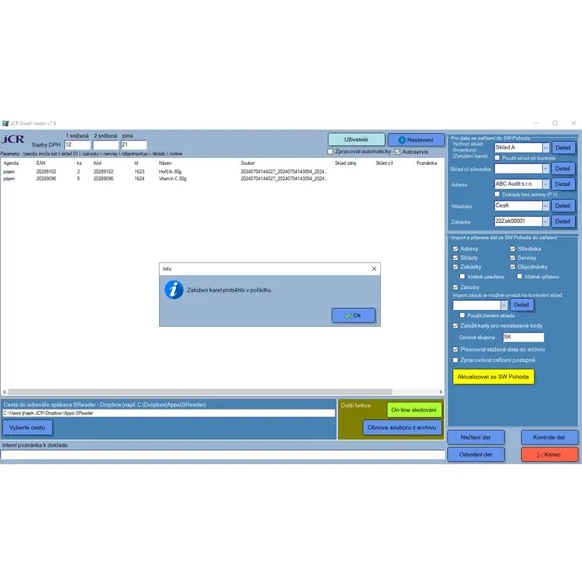 *V případě, že software narazí na položku s kódem, která dosud nemá založenou skladovou kartu, nabídne její vytvoření, v aplikaci je možné doplnit název. Karta je potom založena pouze s kódem, názvem a množstvím a po importu je možné ručně v POHODĚ doplnit ostatní údaje.